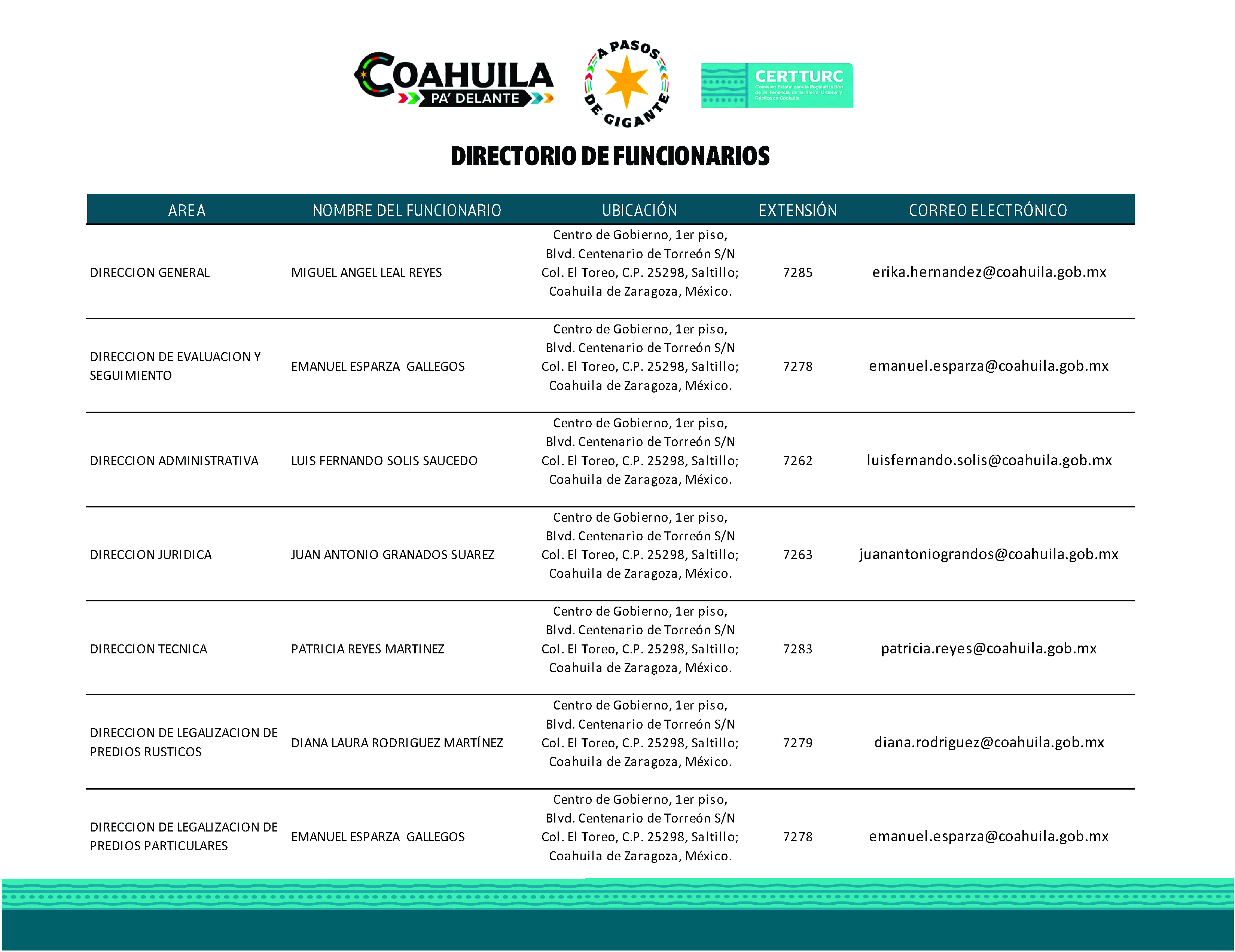 Centro de Gobierno, 1er. Piso, Blvd. Centenario de Torreón S/N, Col. El Toreo, C.P. 25298, Saltillo; Coahuila de Zaragoza, México.